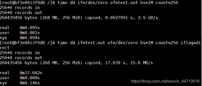 然后再运行dd命令,对容器读取数据速度进行测试,和–device-write-bps类似,iflag=direct是对–device-read-bps的读取速度进行限制。